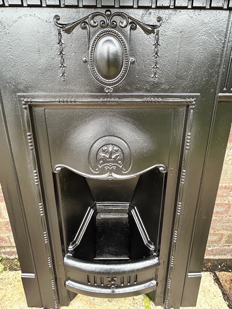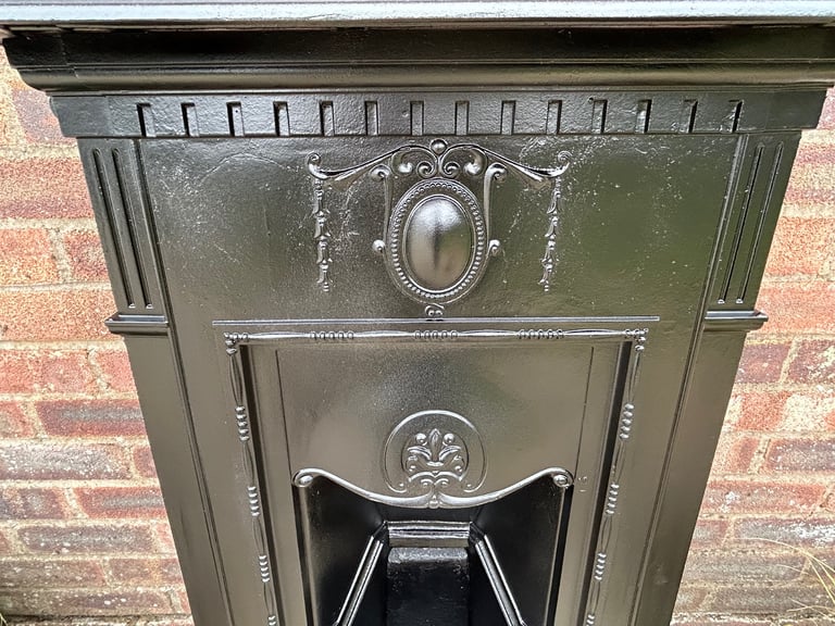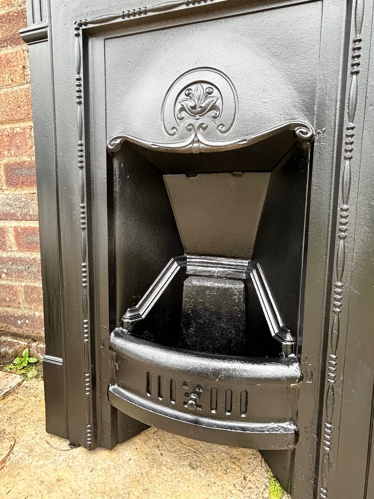 This fireplace is almost completely original which was blasted and repainted in Matt black metal paint and is for decorative purposes.