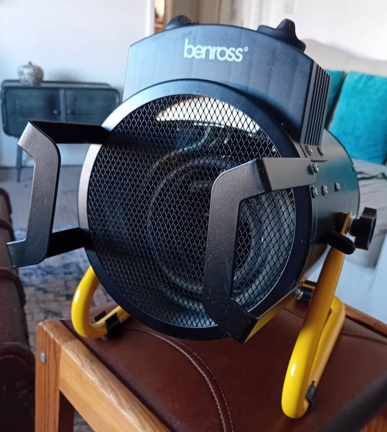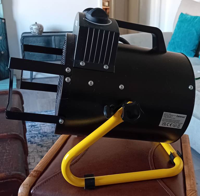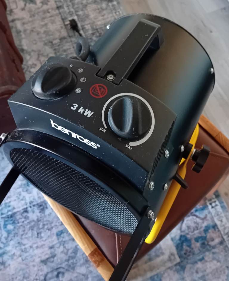 Benross industrial style 3kW fan heater. Rugged construction, swivel-stand, with variable heat-control. Buyer collects, or will deliver local.