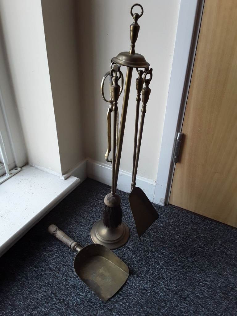 Antique Fire companion set, brass, tongs, brush, poker, 1 x hanging ash pan. Separate ash pan not inc.Job lot. ( red f 40.. 8.12). COLLECTION, City ctr NR1 1LA