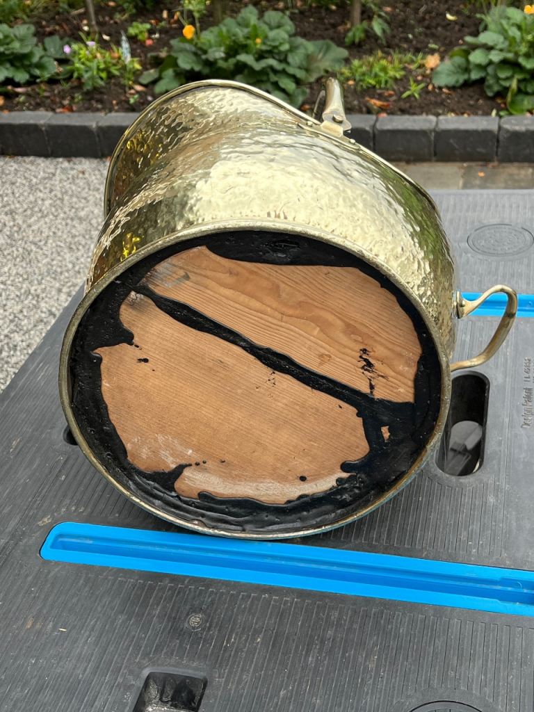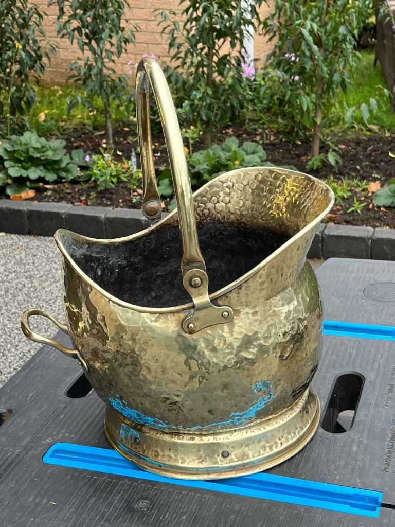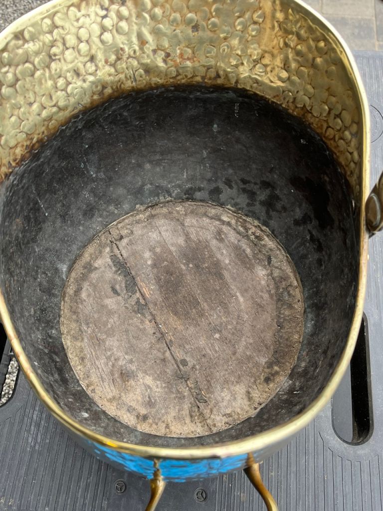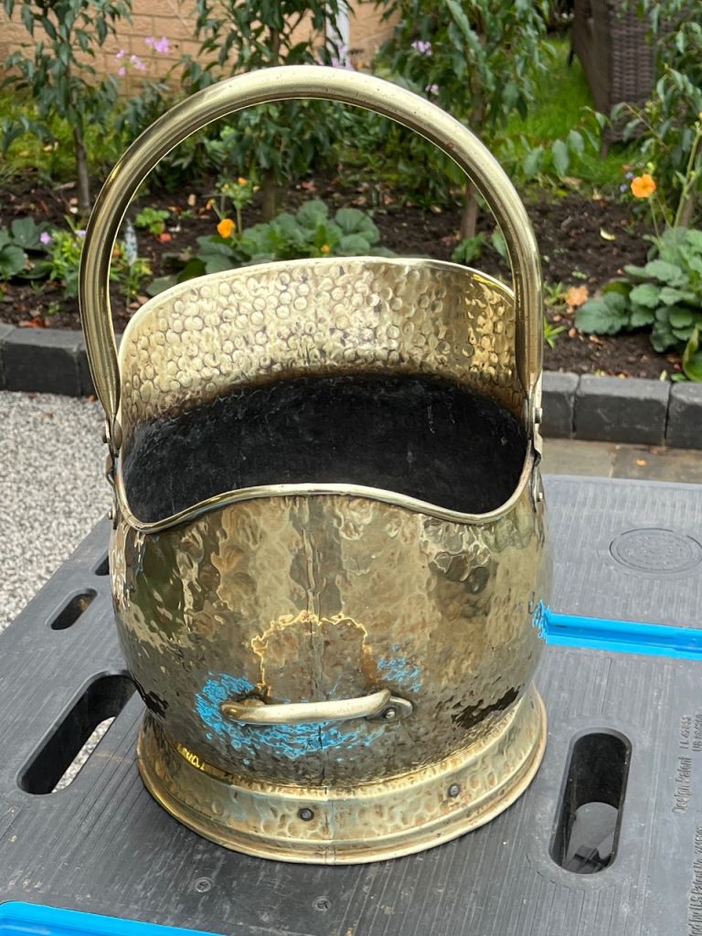Antique brass coal/log scuttle in lovely condition. Hammered effect, Cleans to a beautiful shine making a very attractive fireside decoration. The wooden floor of the scuttle has been renovated to replace rotten wood. Buyer collect.