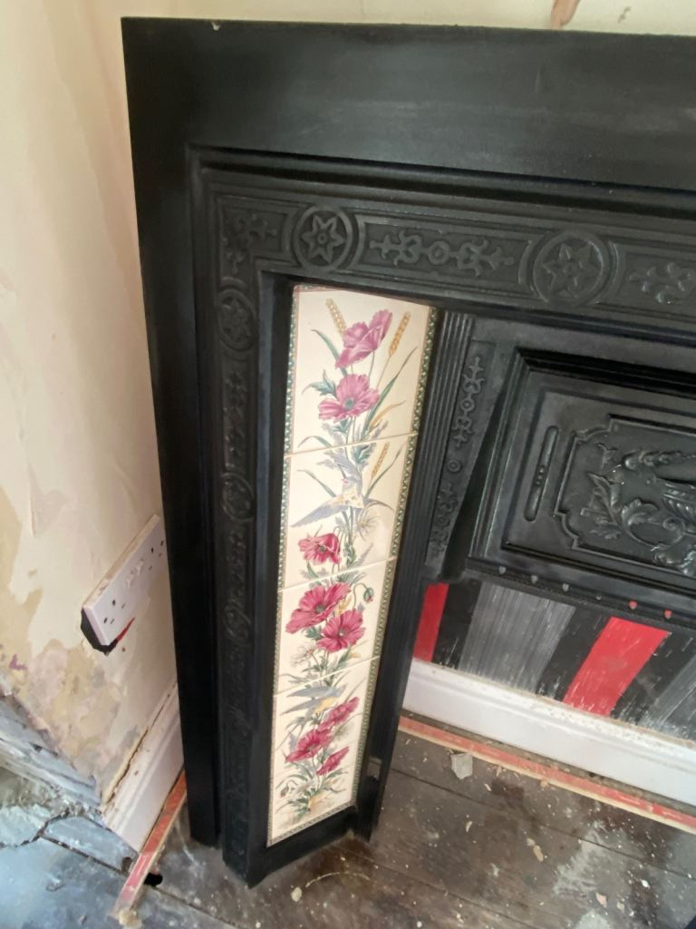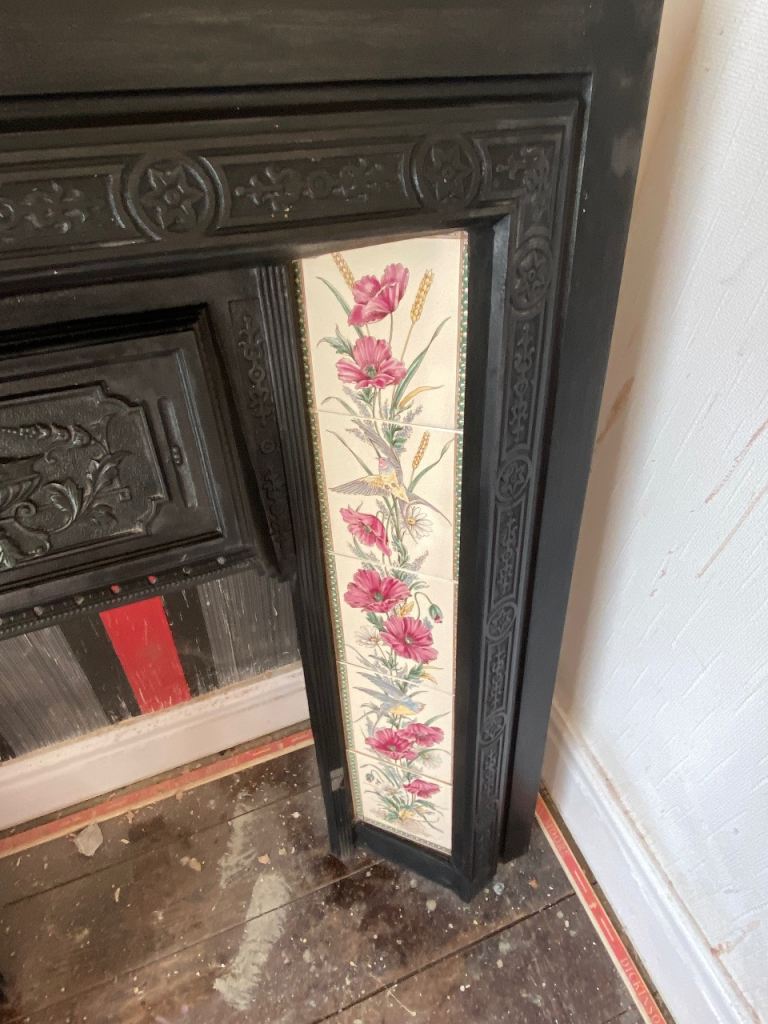 Black cast iron fire surround with tiles either side - all tiles fully intact pick up only L31 Liverpool will consider sensible offers