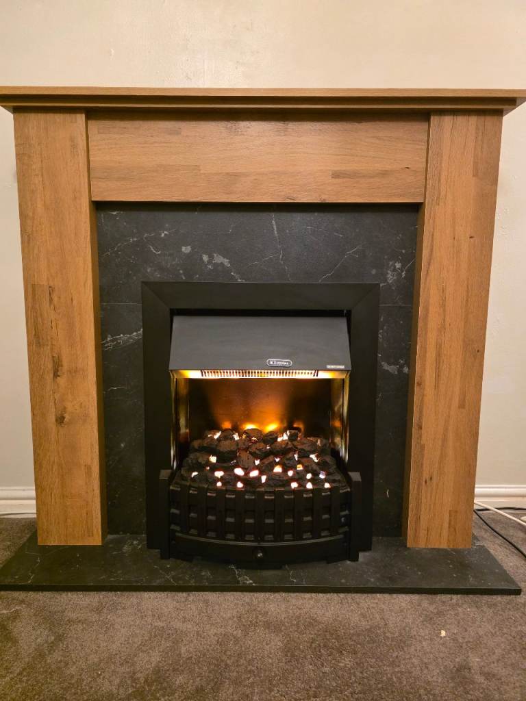 Wood fire surround with black marble effect hearth/surround.