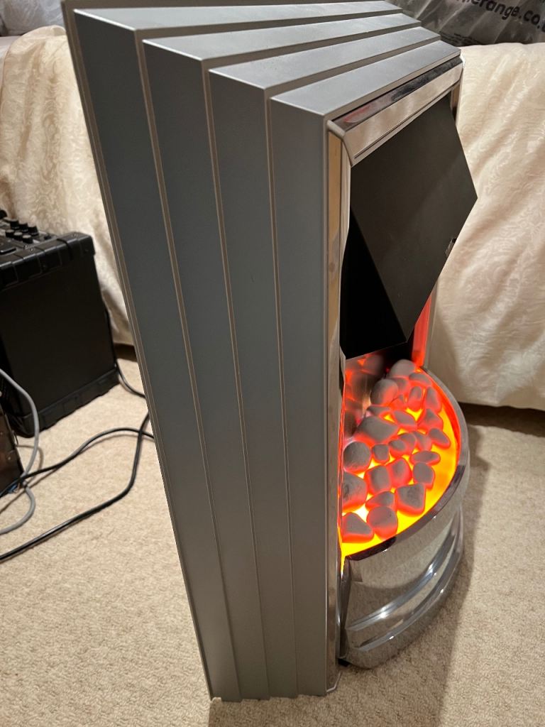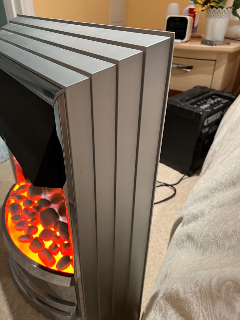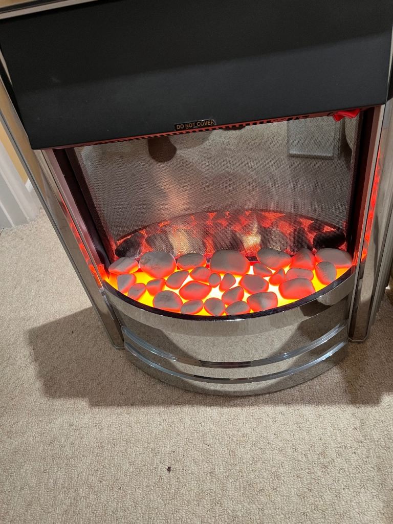 Dimplex Castillo CST 20 free standing 2Kw electric fire with white pebble or coal effect (coals unopened never used) chrome and satin silver finish. Opti flame effect can be used alone with no heat. 2Kw fan heater with 2 heat settings. Has spare switches ( one was replaced afew months ago pack of 3 purchased at the time). Can been seen working very good condition used in conservatory for back up heating when needed. Comes with the original instruction sheet