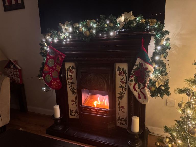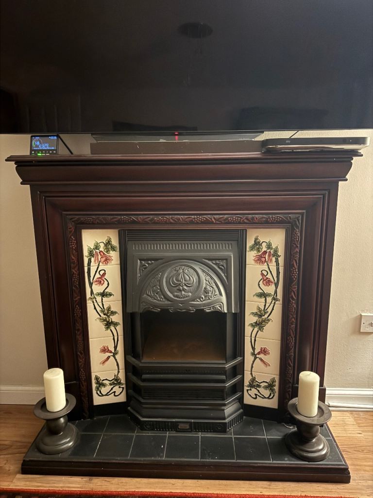 Free standing electric plug in fire place and surround. Make sun crest, large item. Eight 46 inches, depth 40 inch at the bottom, width 49 inches. Collection only