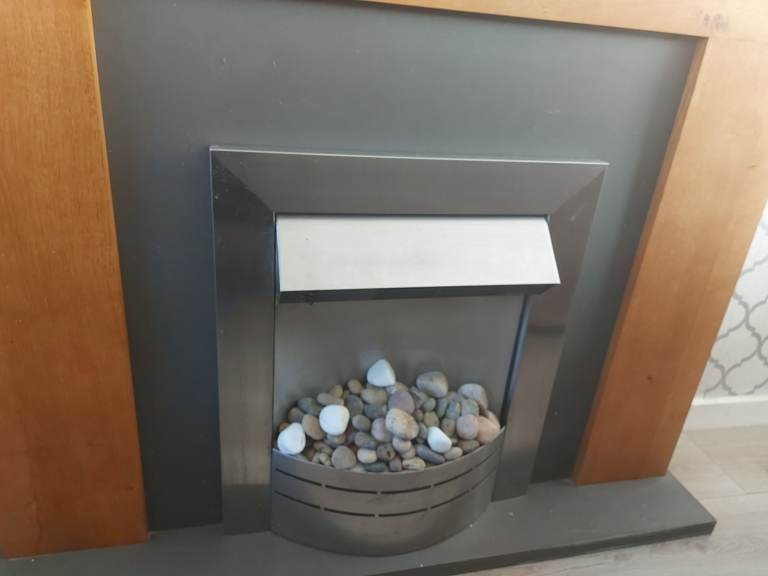 Solidwood fire surround with chrome fire which has light grey ,white stones the fire has two heat setting or you can just use the fire glow it has a grey/black hearth and back of fire