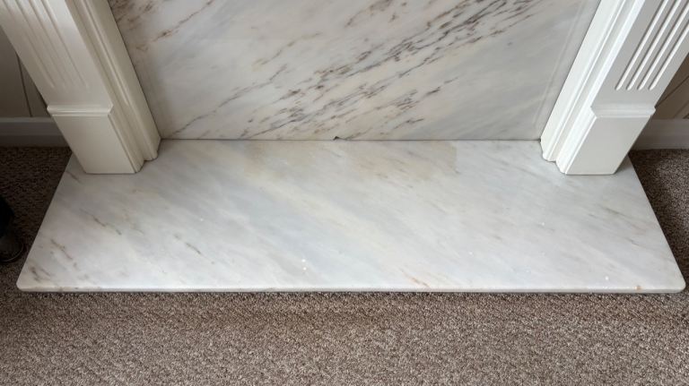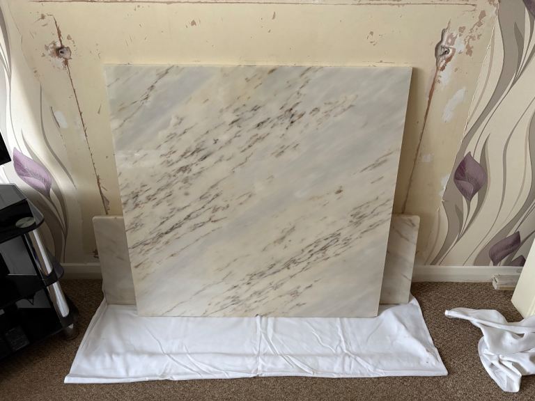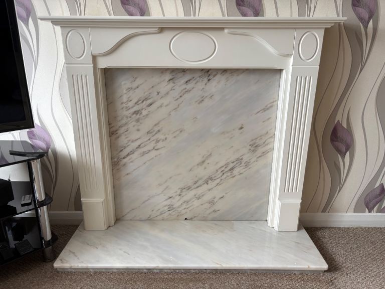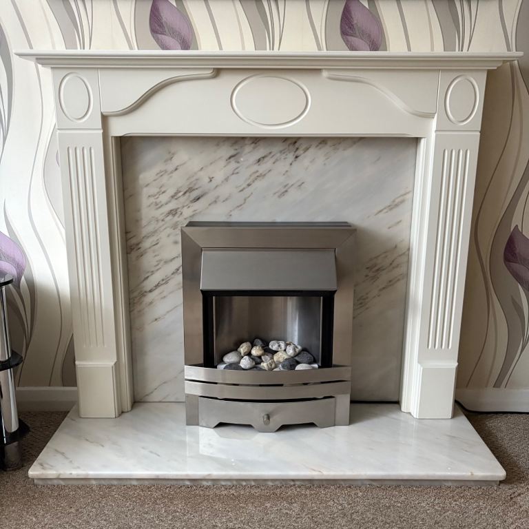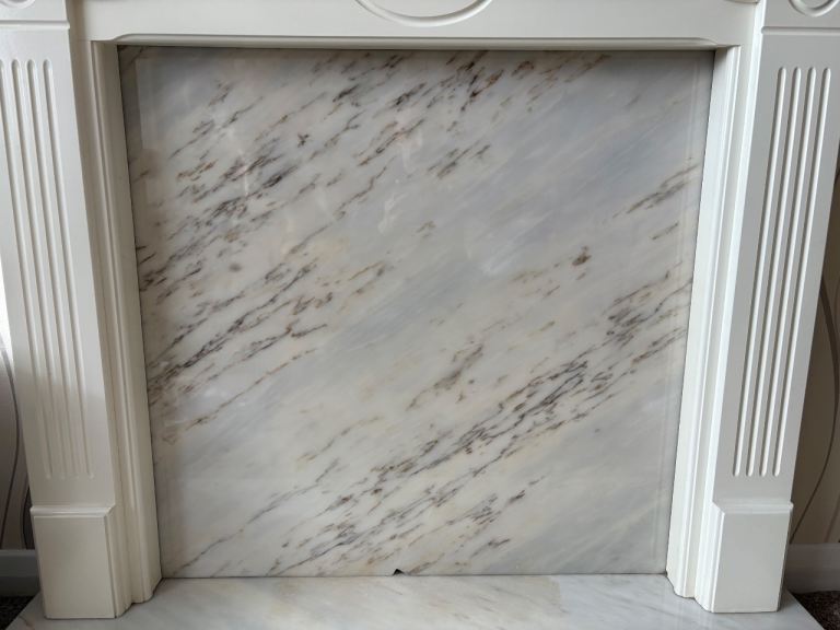 The marble back has NOT been cut for an inset fire as we prefer to have free standing electric fires, so you will be able to choose how you want to use it yourself, either to cut to fit a fire, or leave solid for decorative projects.