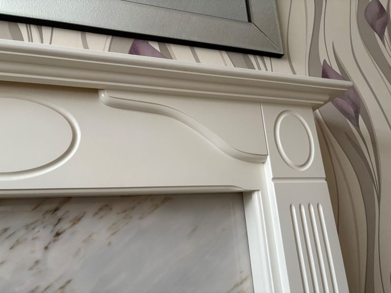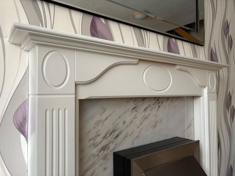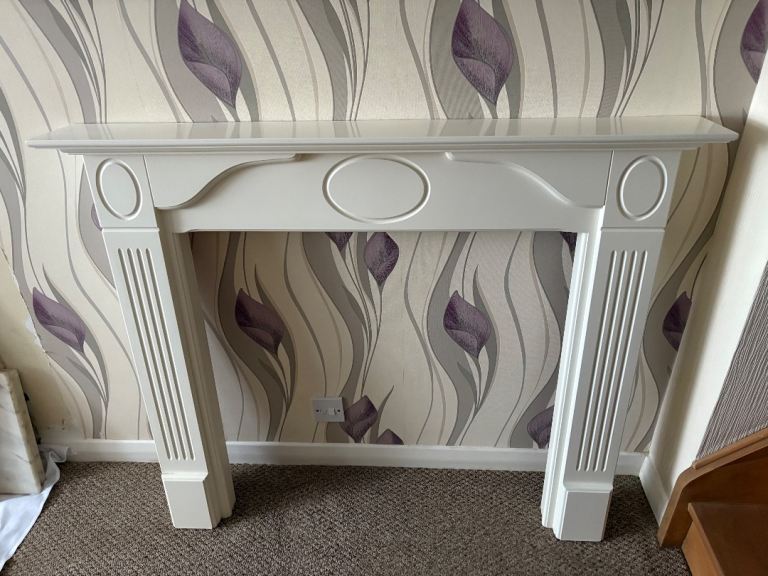 White wooden fireplace surround.