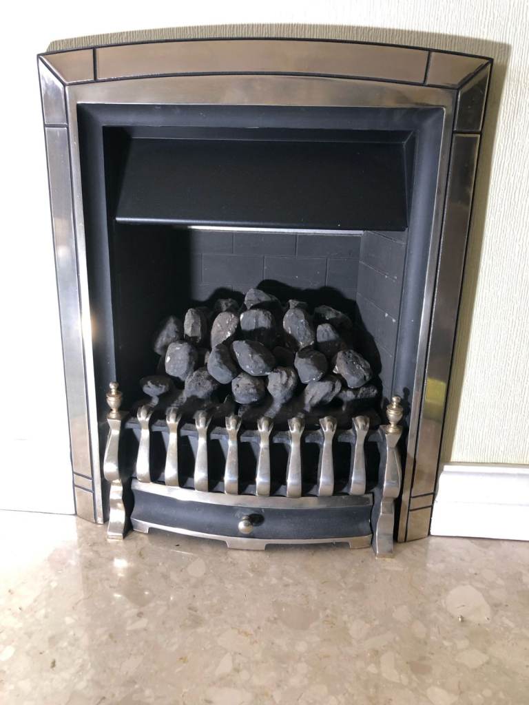Wooden surround, decorative tiled inlay, cast iron fireback/doggrate