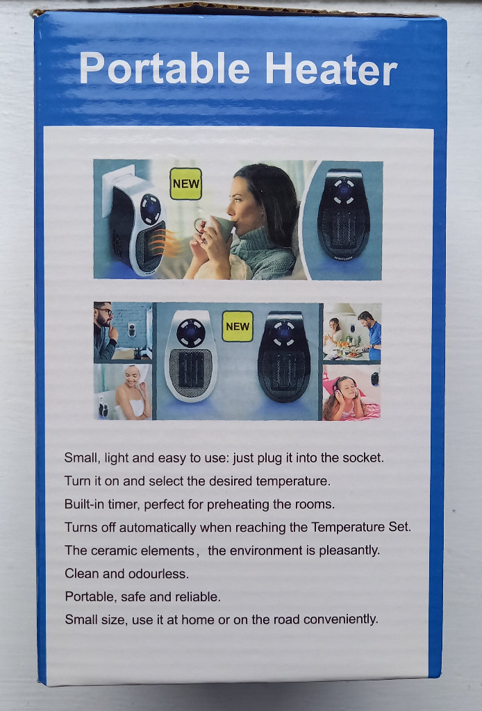 Small plug in portable heater which is useful for small spaces. Brand new and unopened.