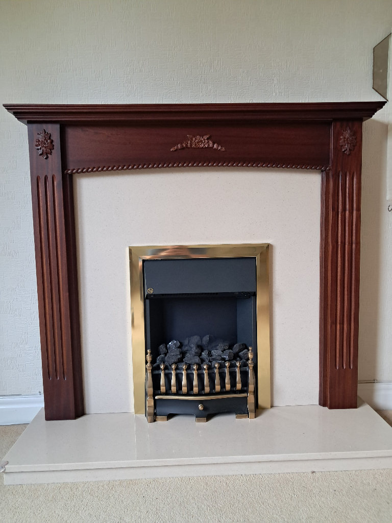 Mahogany Fire Surround, Granite hearth & backpannel, electric fire