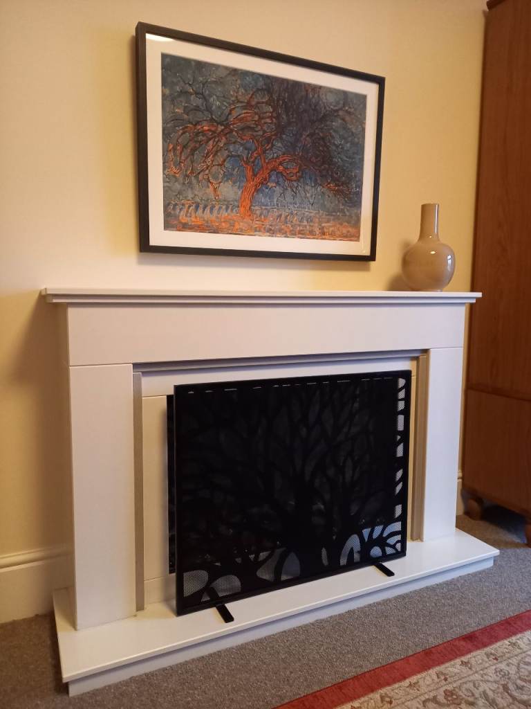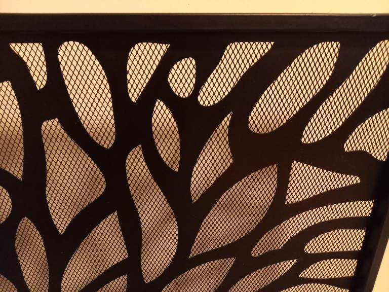Contemporary tree-like design fire screen finished in sleek midnight black with mesh insert to keep sparks at bay. Single panel design with two feet for stability all manufactured in robust steel by the craftsmen at Black Country Metal Works - measures approx. 76 cm W by 62 cm H