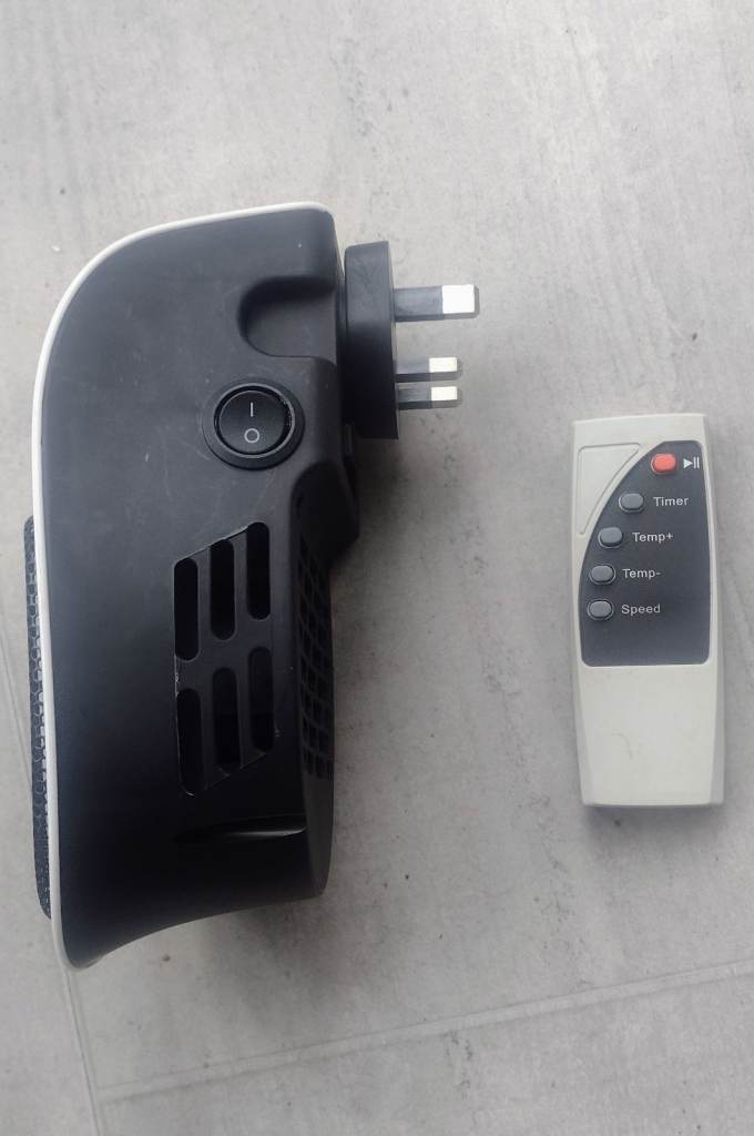PLUG IN CERAMIC FAN HEATER WITH REMOTE CONTROL, ABLE TO SET TIMER AND TEMPERATURE, USES VERY LITTLE POWER. IDEAL FOR SMALL ROOMS OR CONSERVATORY. I HAVE TWO OF THESE FOR SALE, PRICE IS FOR EACH ONE, A DISCOUNT FOR THE TWO.