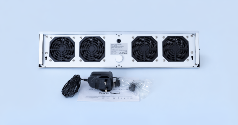 Smart Air. Gives your radiator a boot. With LCD display showing Degree reading, Battery charge, Level Fan Speed Setting. Unit includes Thermostat probe, Safety Magnet, Air Inlet. Stabilising feel slot. With Batteries & Charger. The fan takes radiator heat and expels it around the room.