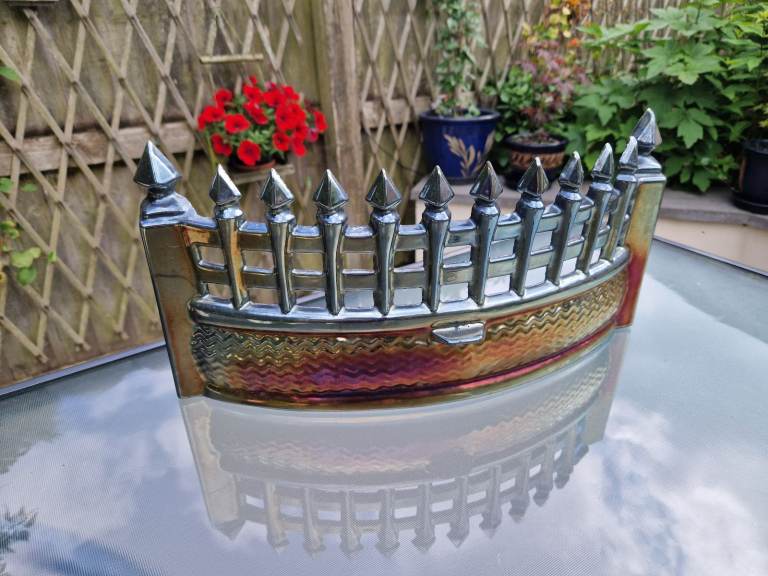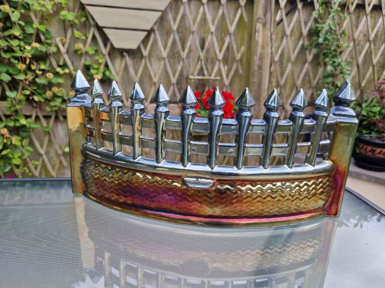 Vintage cast iron fire fret in carnival lustre enamel. In very good condition for age. Please see photos. Size is 16 inches wide by approx 7 inches high.