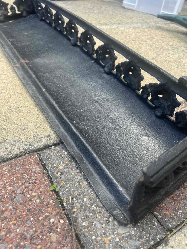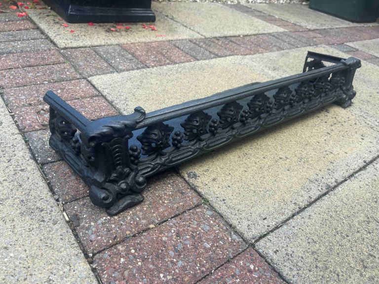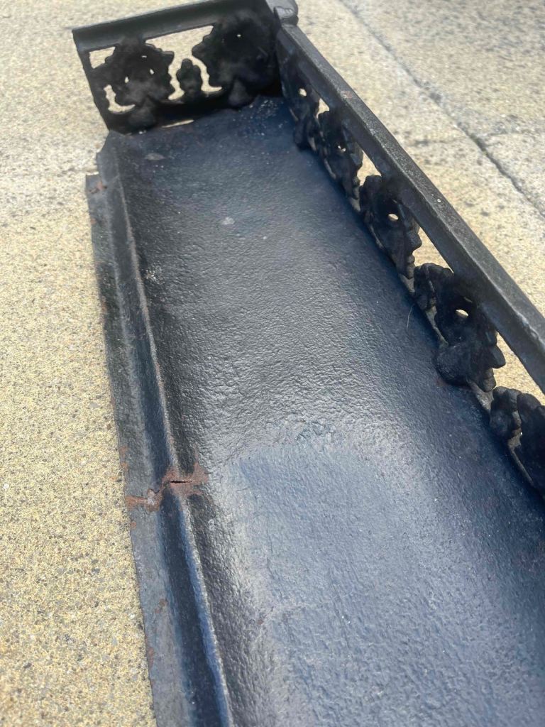 Vintage black metal fireplace curb. Some minor damage - see photos - but good for its age. 82 x 13 x 19 cm. Inspection welcome and/or use Anyvan