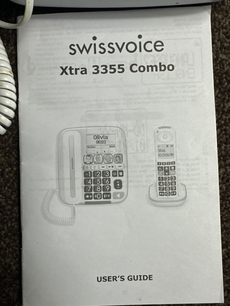 Swissvoice Xtra 3355 Combo telephone set in good working condition. Includes main corded base unit and additional cordless handset with charging dock.