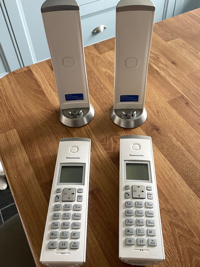 2 x Panasonic KX-TGK220E telephones in excellent condition. Price is for 2 phones. Check out the spec and more photos on Panasonic website. The phones can talk to each other so you can communicate with someone in a different room. You can answer from either phone and you can roam from room to room with the phones