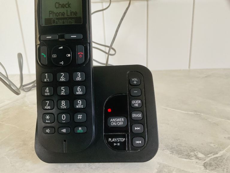 Panasonic digital cordless phone with answering machine, easy-to-read dot-matrix display and a hands-free speakerphone. 2 x additional handset with charge station included.