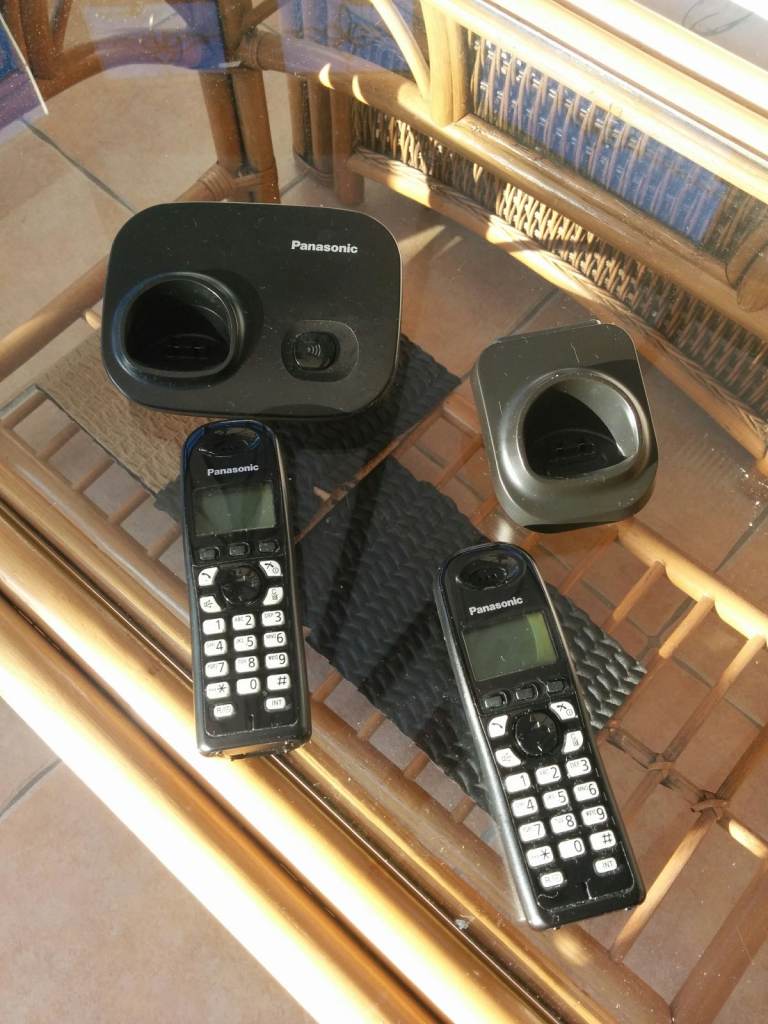 Panasonic triple cordless phone in black. 100 name & number directory with a backlit display. Requires replacement rechargeable batteries