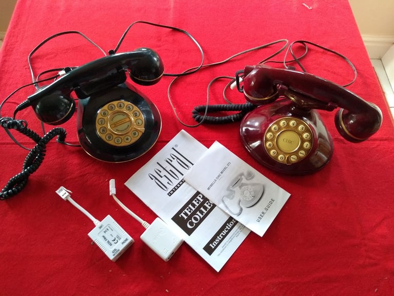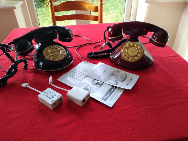 Full working order, or you could simply use as decorative items. One is dark green, other is dark maroon. Complete with instruction book. Suitable for homes with classic phone line/broadband into the house (meaning the street/road has fibre broadband, then the house has traditional copper wire connection from the street into the home). Complete with flex and connecters to plug into standard phone points in the wall, plus (detachable) broadband/phone switch filters, as shown on the photos. For homes with full fibre broadband cable all the way into the home, these phones can’t operate but can still be used a decorative items.