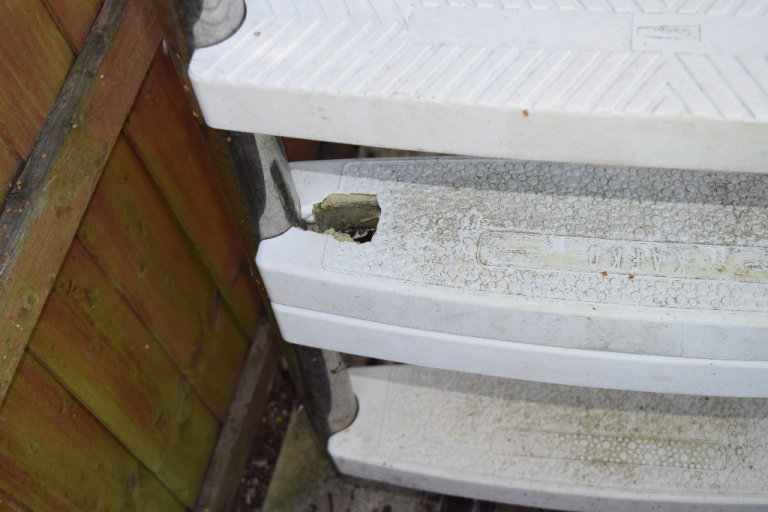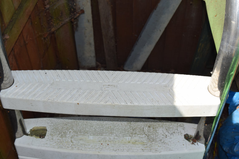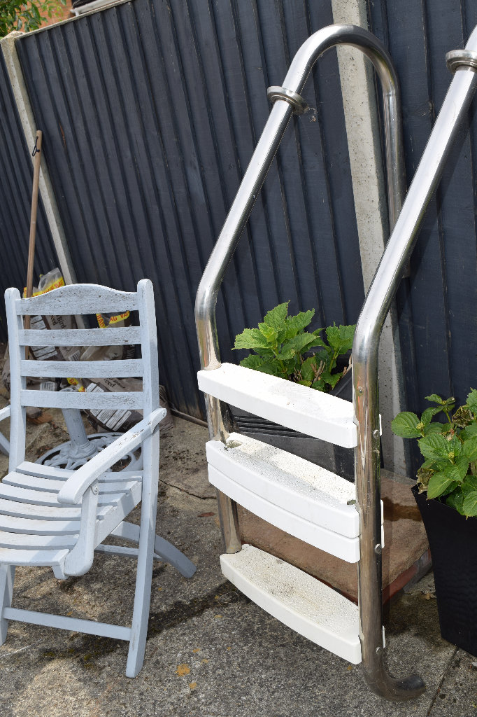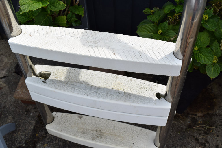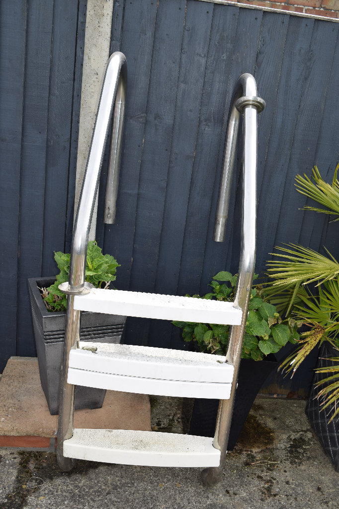 Swimming pool steps for sale. no longer have pool, photo of the steps in pool. been filled in due to illness and age, the steps are in reasonable good condition, but will require 1 new step, l have replaced 1 new step and been using the faulty one on top of the other faulty one as photos show. and it has been ok.as you know the complete steps are very expensive to purchase, and l think £10 is a good price. collection only