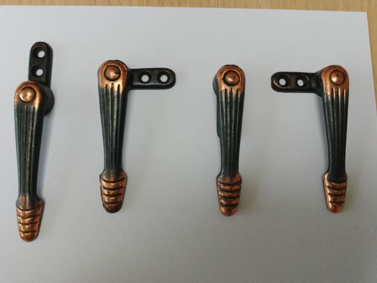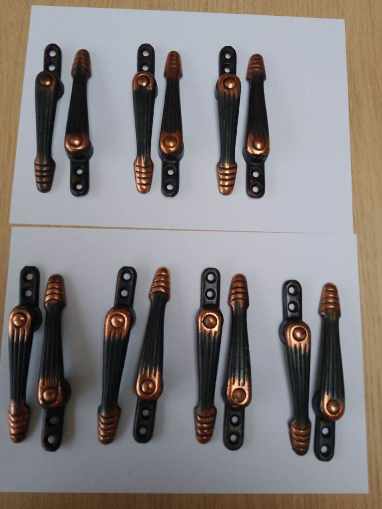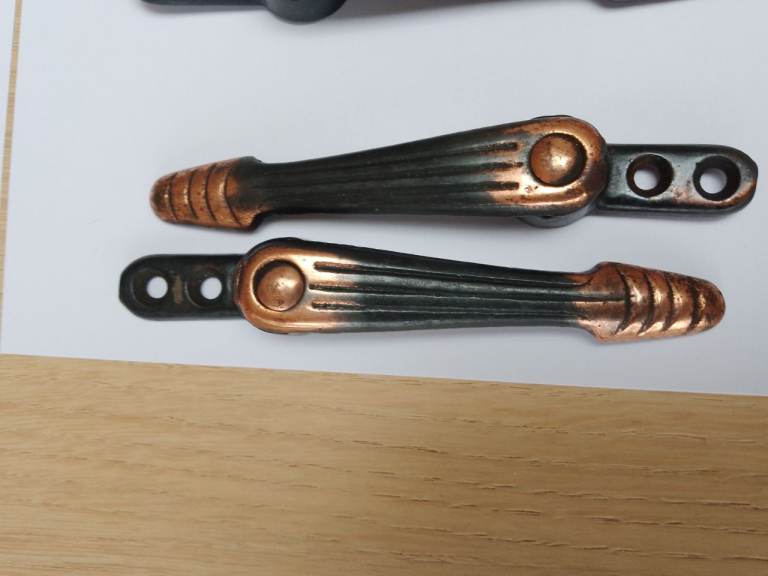 15 grips are the same design; the other is a more ornate, coppered design (see photos).