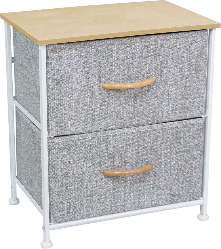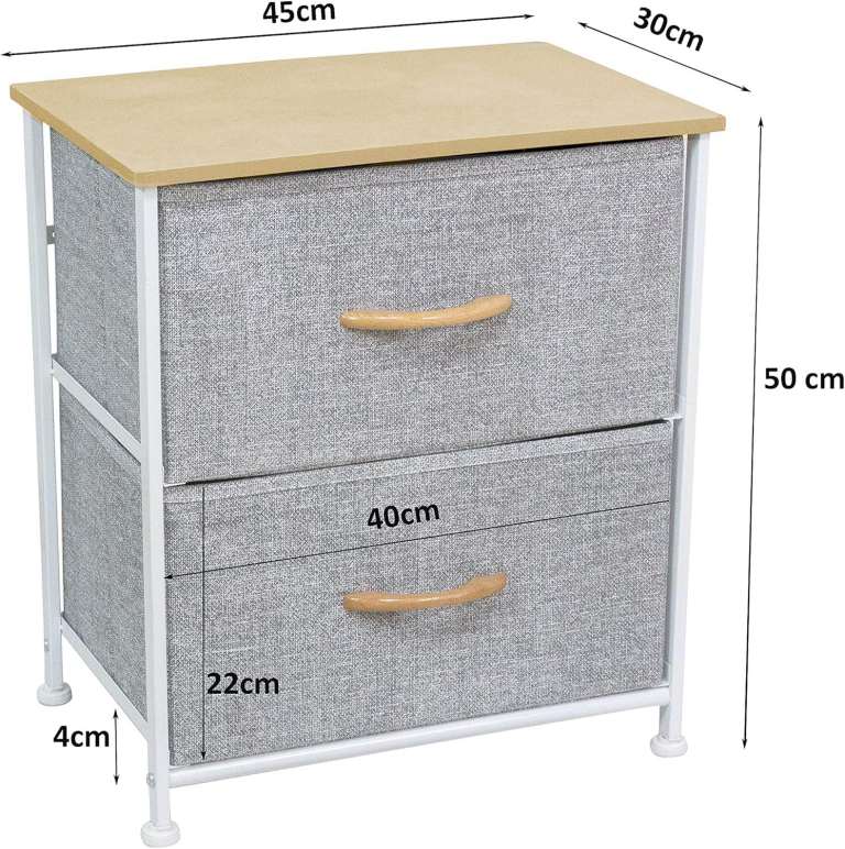 THESE 2 STORAGE BEDSIDE CABINETS HAVE WHITE METAL FRAME, ADJUSTABLE FEET, 2 DRAWERS WHICH ARE MADE OF CANVAS, LIGHTWEIGHT, THE DRAWERS HAVE WOODEN HANDLES AND THE TOPS ARE LIGHT BROWN. THE CANVAS DRAWERS ARE A MINK/GREY COLOUR