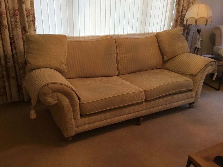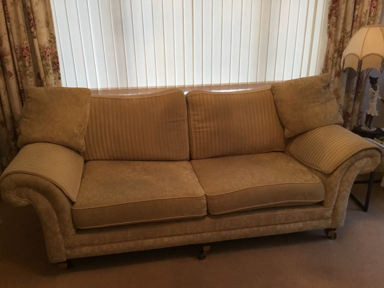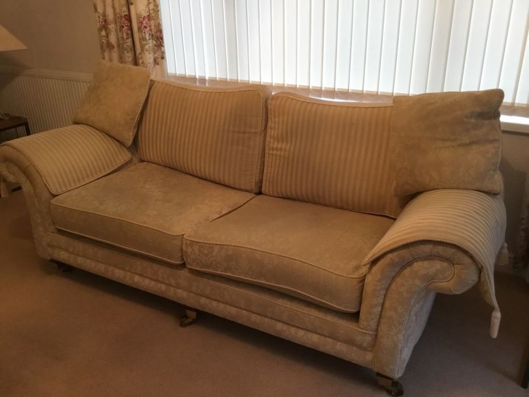 3 seater sofa made by Sofa Sofa Newport in pale gold with matching arm protectors and 3 cushions. Sofa is 220 x 93 in good clean condition. Only being sold as down sizing.