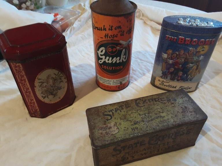 4 empty collectable tins. State Express cigarettes, Gunk, vintage tea caddy and a Broons tin.