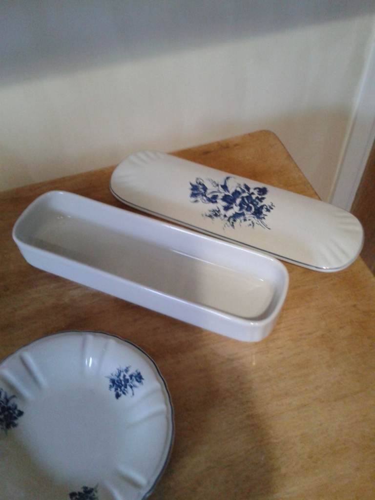 Beautiful, brand new 5 piece jug and bowl set with jug, bowl, bidet, soap dish and jewellery dish with lid. Contemporary look base on antique design. Made by Staffordshire Iron Stone, England. No chinks or cracks, all in mint condition.