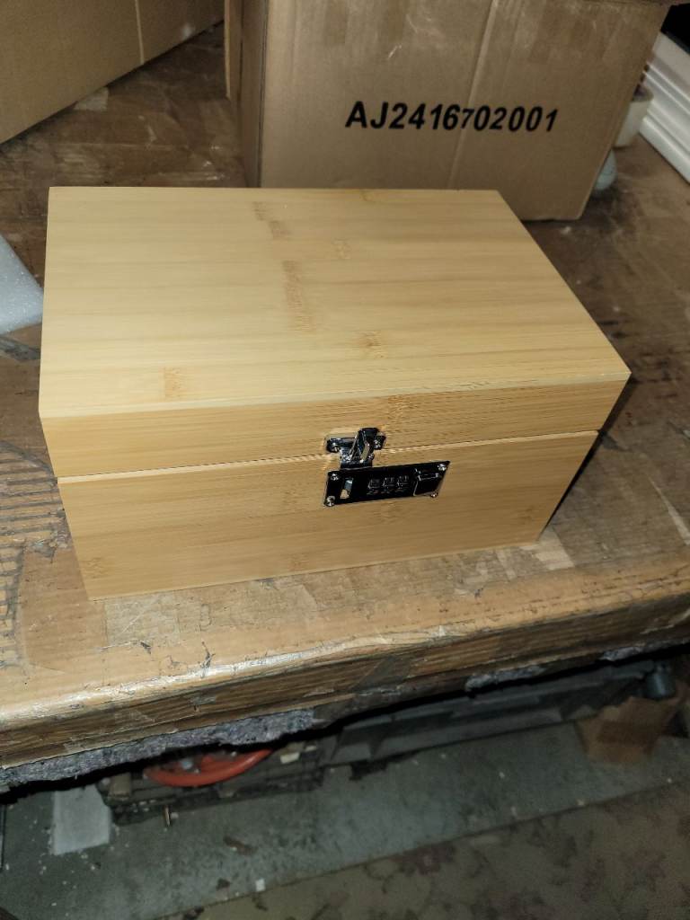 A new bamboo storage box with removable divider and Secure Combination Lock for Valuables or Keepsakes ect the measurements are enclosed in the pictures the r.r.p is 29.99 we are selling it for 15.00 collection only it is st aidens Church summer Bank Road Tunstall st6 5ey we are there mon to fri 9am to 3.30pm Saturday 9am to 3pm closed Sundays with thanks ( we only hold items for 24hours only) .