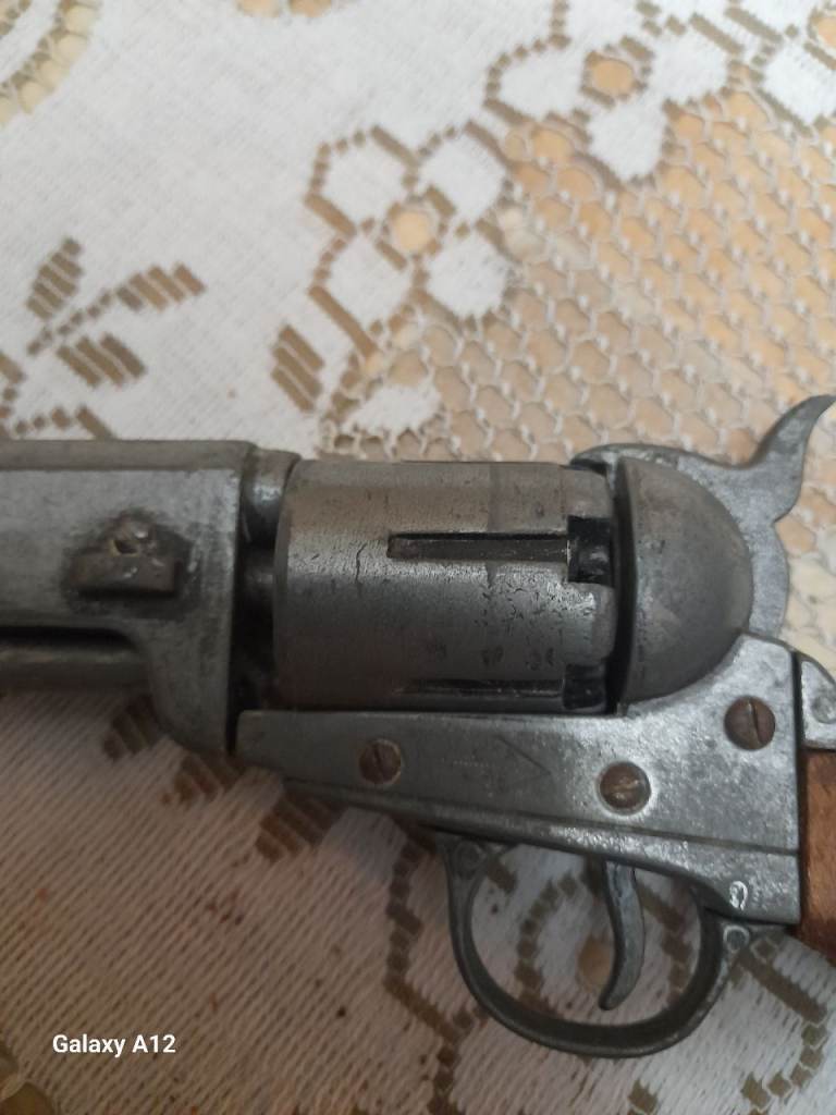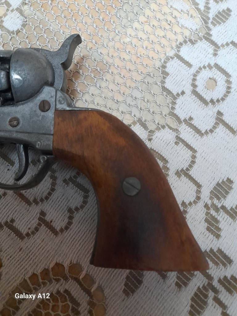 This is an excellent copy of an old western cowboy pistol and looks very authentic. It is made of metal and wood, the barrel revolves and would even take a brass blank.