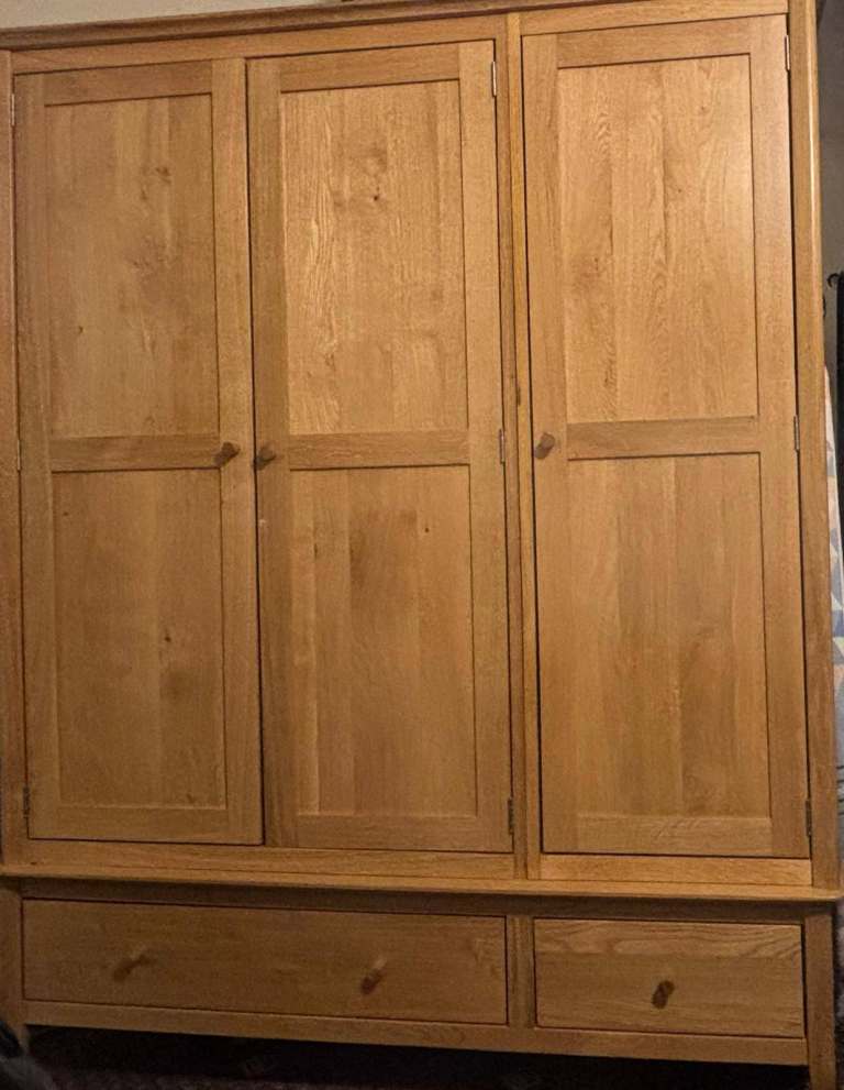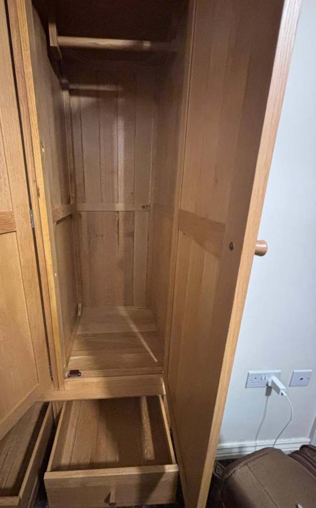 Its pure oak bedroom cupboard bought from Oak furniture land, no damages looks like new very good for clothing hanging etc. Heavy in weight Price can be slightly negotiable as its original price was £1000.