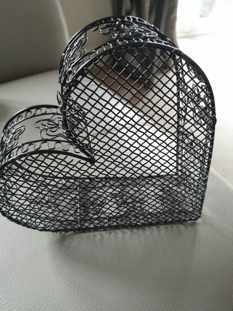 A black heart shaped small wire basket for sale. Ideal for trinkets or jewellery.