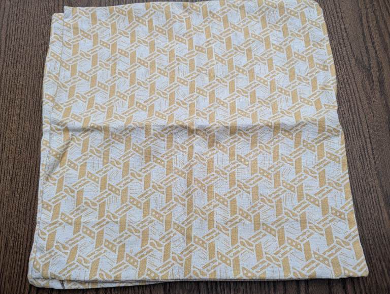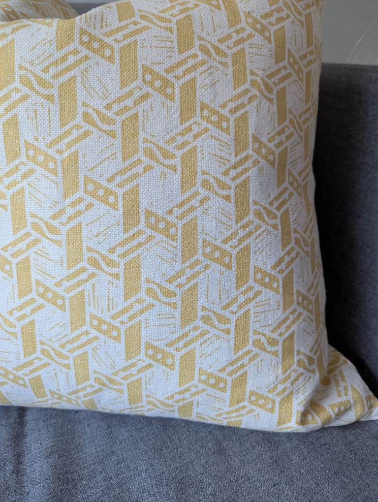 2 X 55cm bepoke cushion covers with zips. Zoe Glencross Malla Amarillo fabric. New and unused. Please note pads not included, best fit would be 60cm pads. Priced low to sell as not needed for a client interiors project (cost over £100).