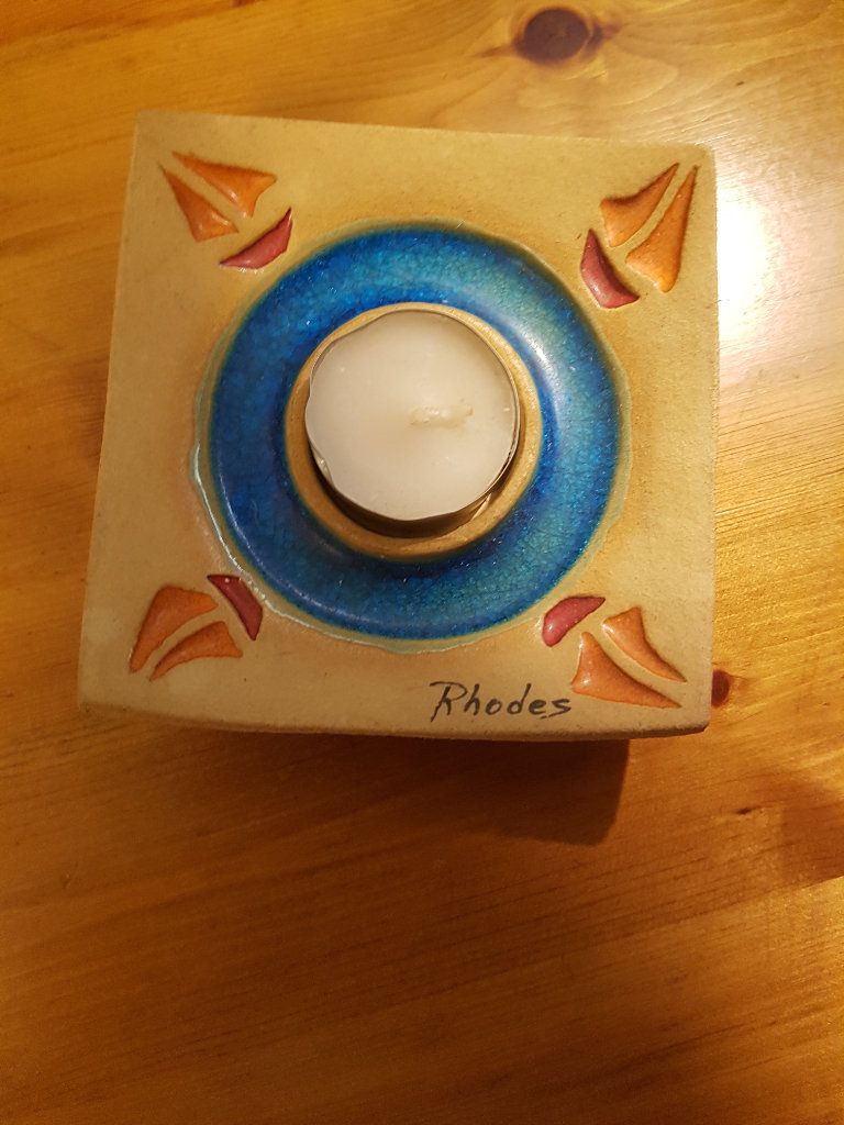 Candle holder t-light marked Rhodes No chips or cracks having a clear out