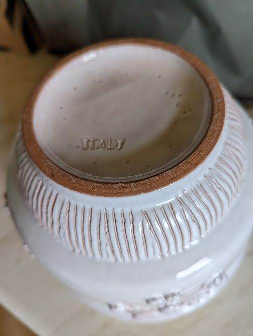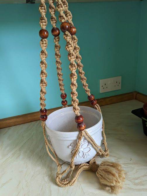 Two mainly white ceramic pots with decoration as shown in the photos, with macrame cords for hanging if required.