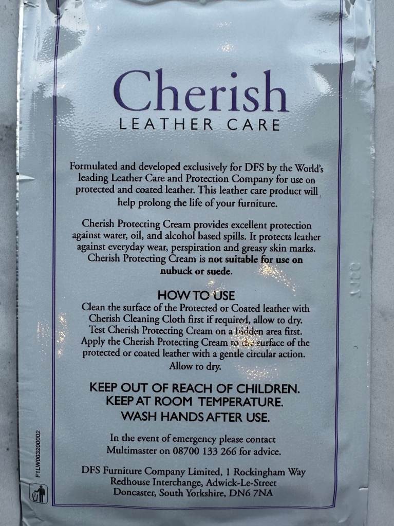 Designed to clean and protect leather furniture. Made by DFS, the kit includes two types of cleaning clothes to help maintain the quality of leather furniture.