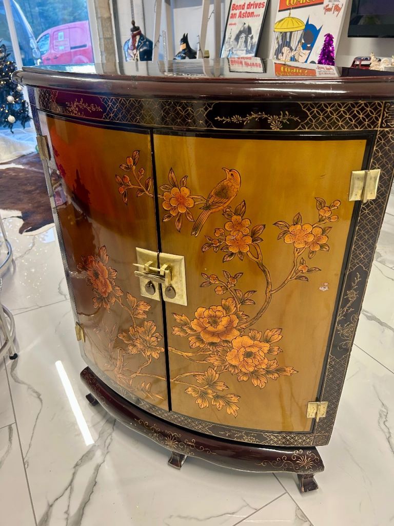 A decorative lacquered corner cabinet with bowed front, the twin doors richly adorned with raised enamelled gilt panels depicting birds and blossoming foliage. Framed with black lacquer borders decorated in gold, and set above a shaped cushion apron with gilt scrollwork on carved feet. Fitted with brass hinges and a traditional padlock clasp. Interior with two triangular shelves.