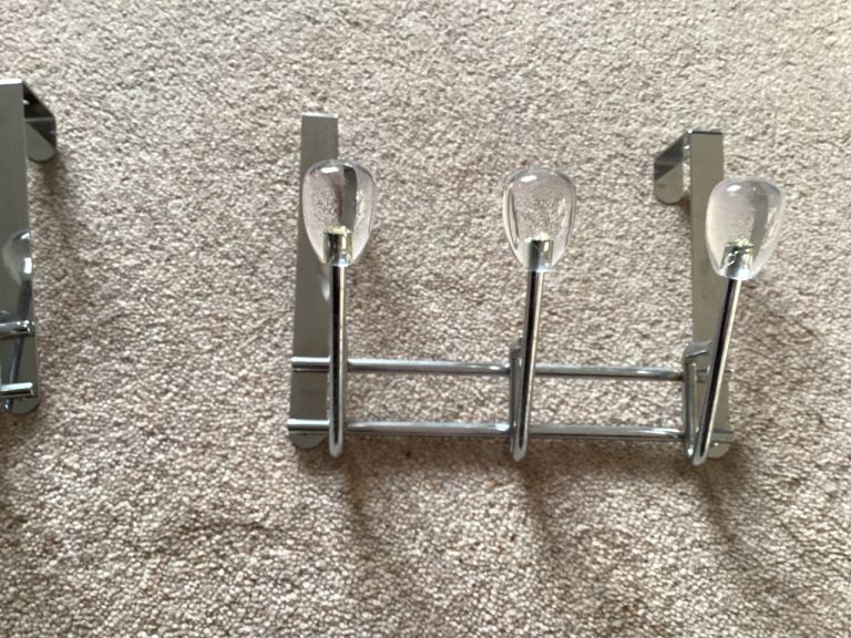 Two chrome over the door chrome hooks in excellent condition, see pictures.