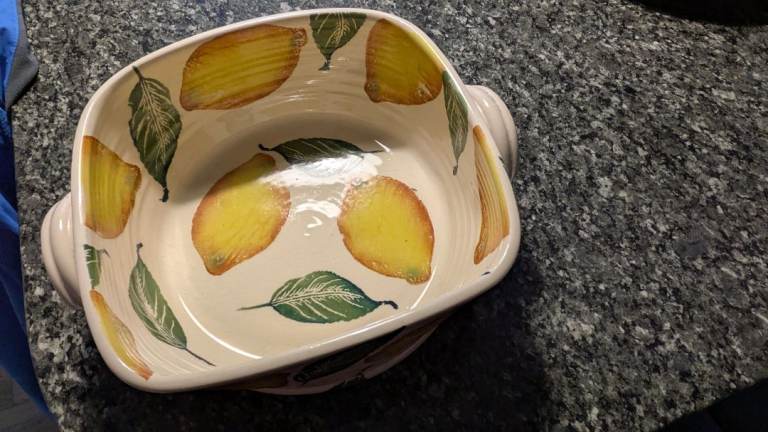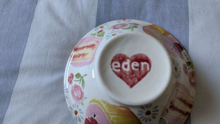 Four pieces of Eden (Newtownards) pottery. Excellent condition. Large cake plate 30cm. Cake pattern bowl 15cm, lemons pattern square large bowl and small cottage garden jug which alone retails at £28. All four pieces for bargain price of £40. Collection only.