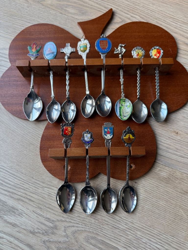 Collection of spoons from many places. 92 in total including wall mount for 12.