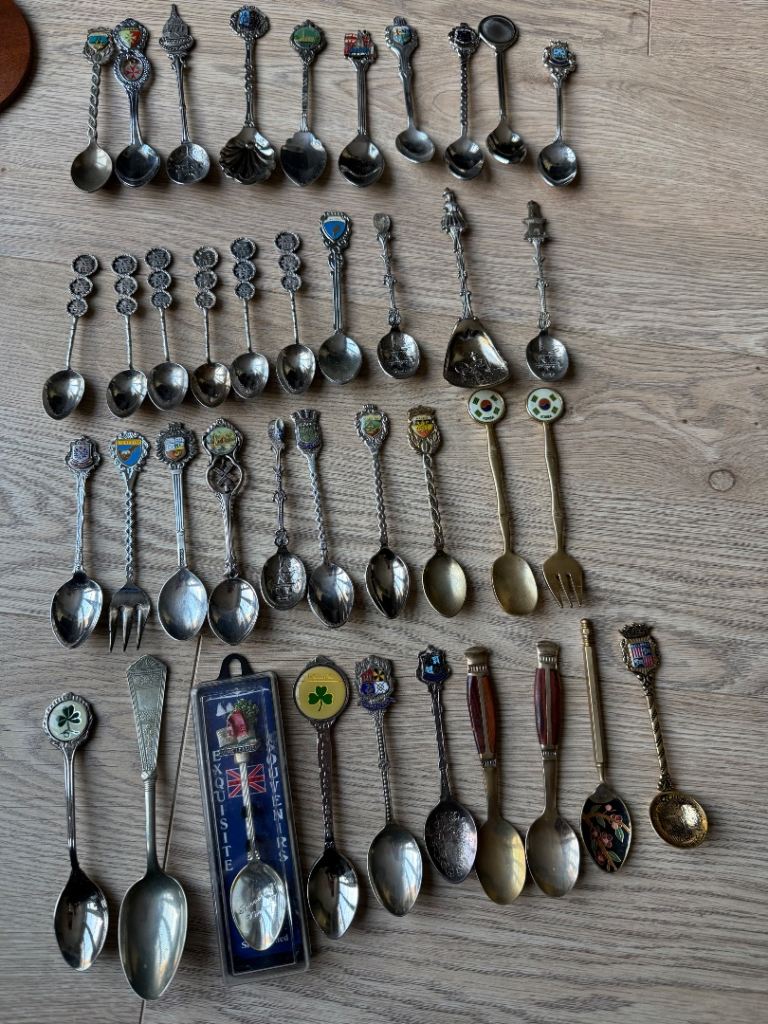 Collection of spoons from many places. 92 in total including wall mount for 12.