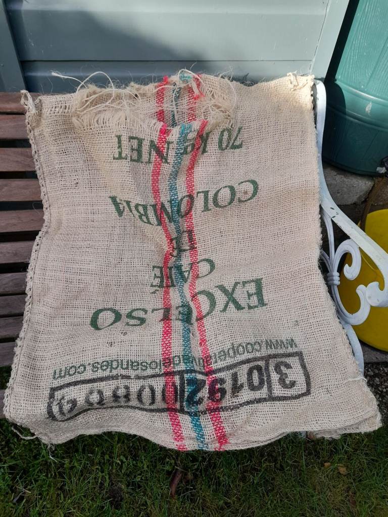 20+ colourful woven coffee bean bags for sale for upholstery or crafting. This ate the size of a black bin bag and cut at one end. Woven natural material with different logos and writing on each bag. £2 per bag or 7 for £11