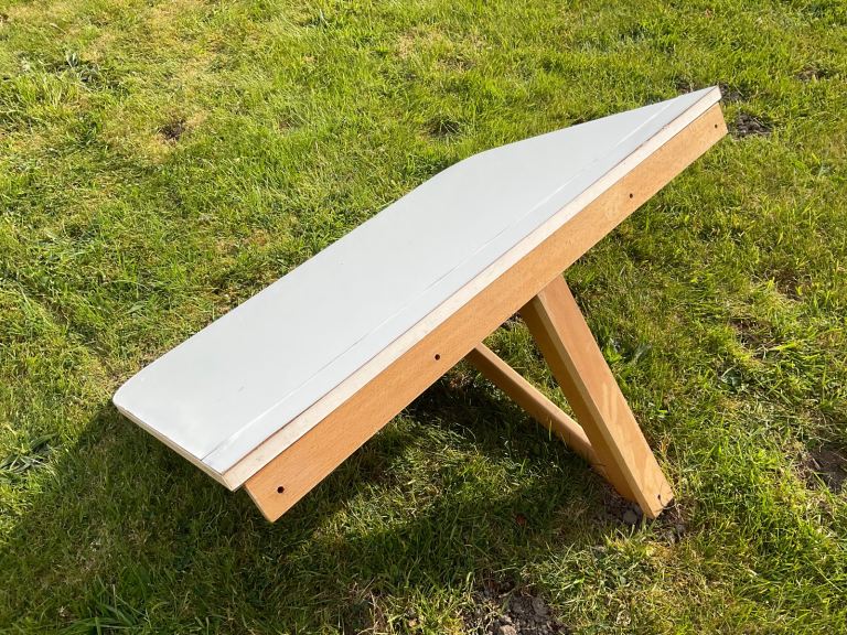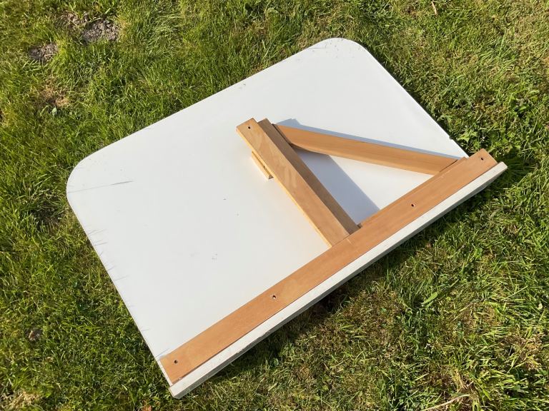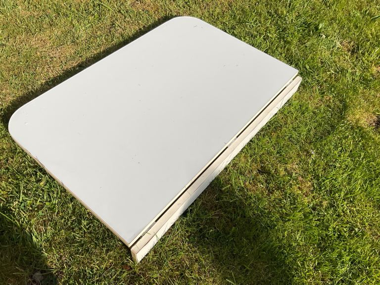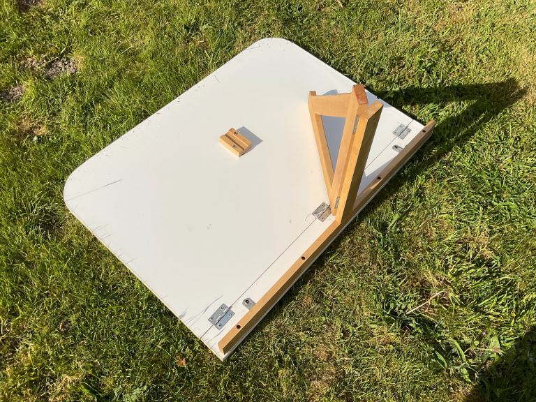 Section underneath folds out to hold table top as shown in photos