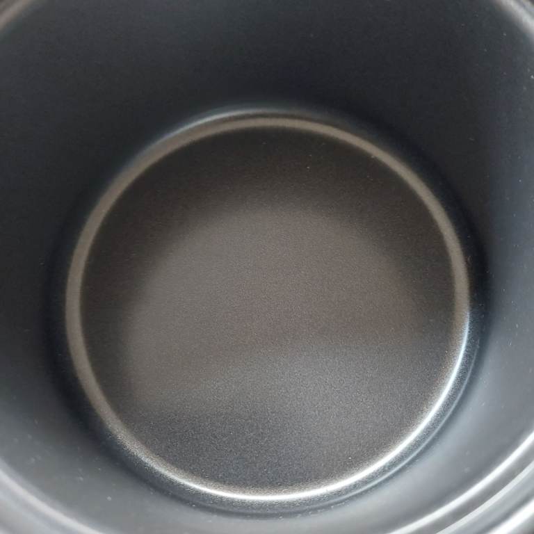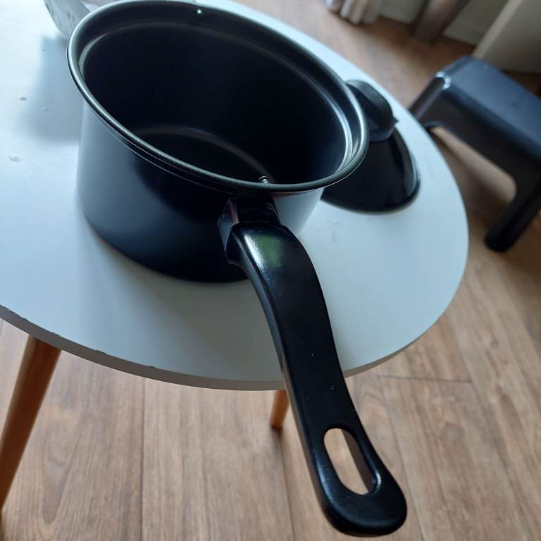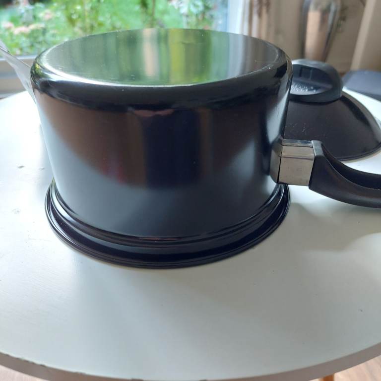New unused cooking pot black none stick holes in lid allows the steam out stop food boiling over and it's also a strainer.