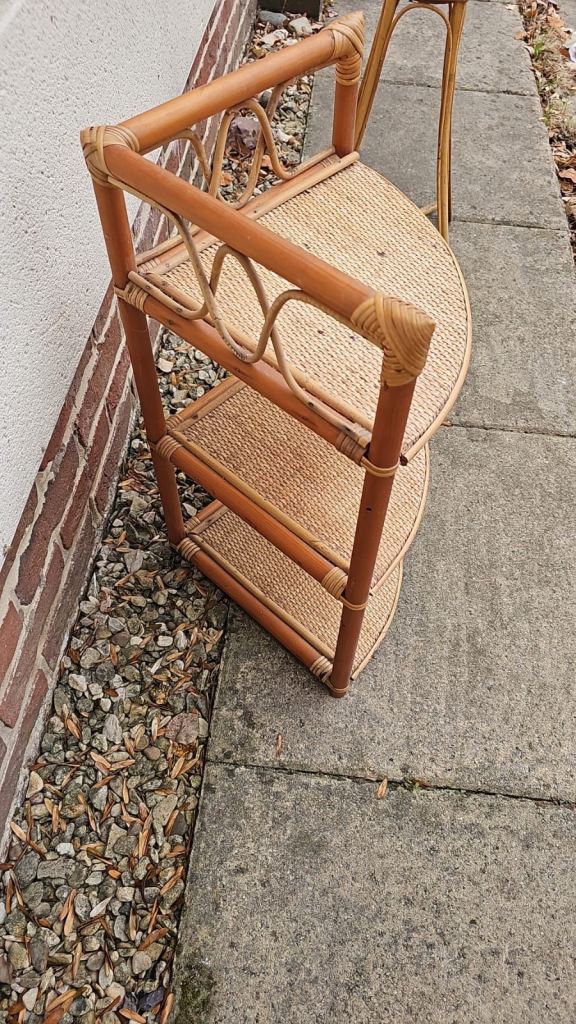 Corner bamboo / wicker shelf unit it’s in good clean sturdy condition. It’s 47 cms wide 34 cms deep and 60 cms tall. Collection is from Malpas Newport np20