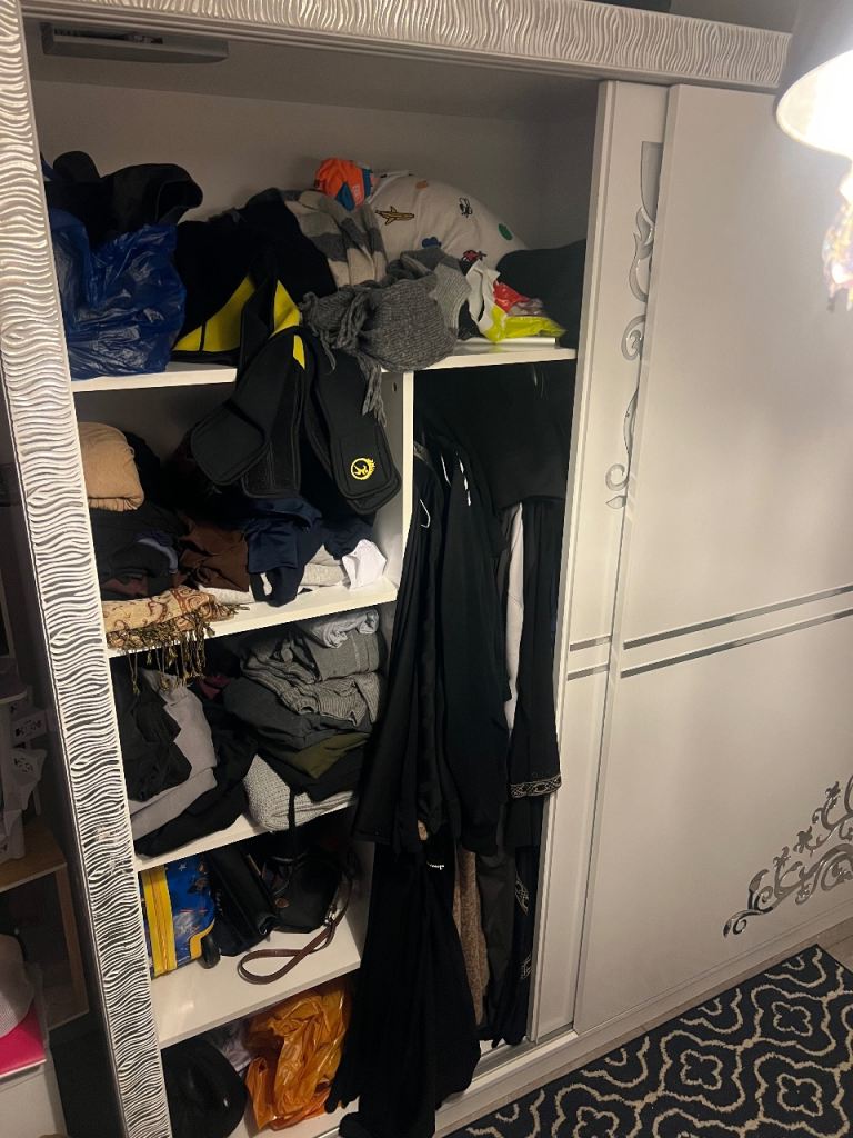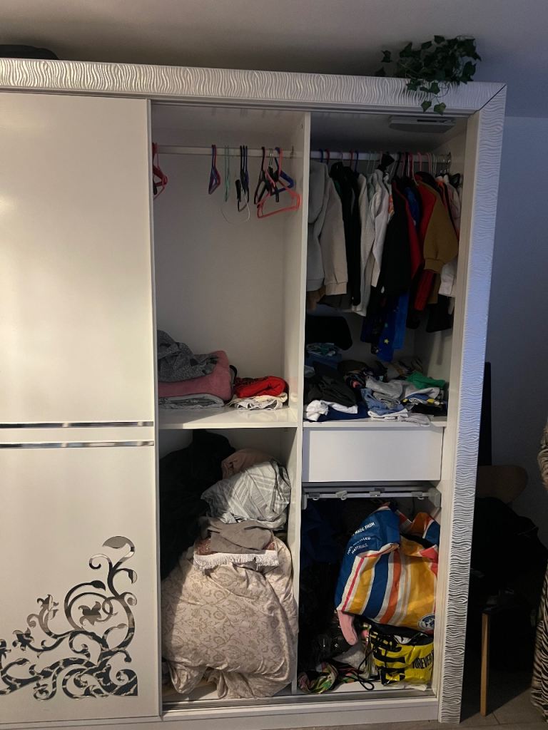 Very big and tall 2 sided wardrobe with space to hang clothes comes with pole (no hangers), 5 shelves a lot of space and slides from side to side