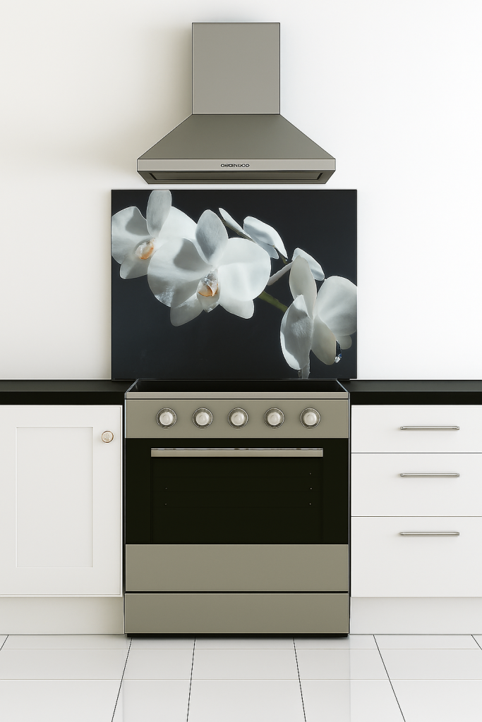 Posting for 4+ monthsDecorative orchid artwork toughened glass, heat-resistant, easy to clean feature piece