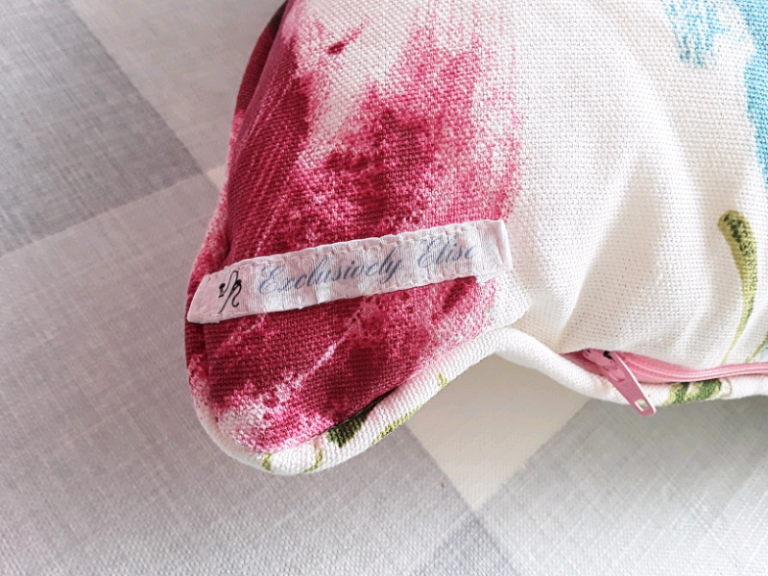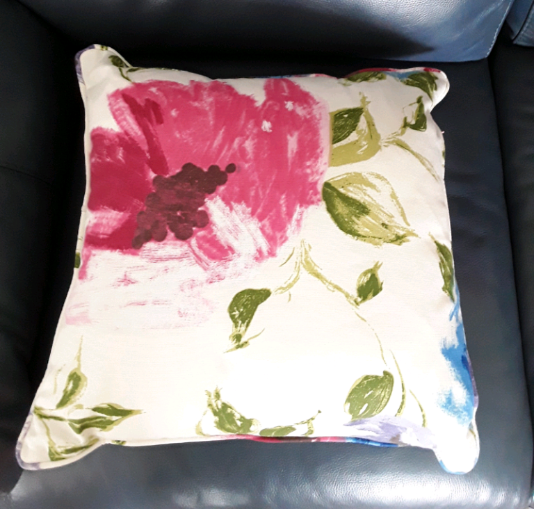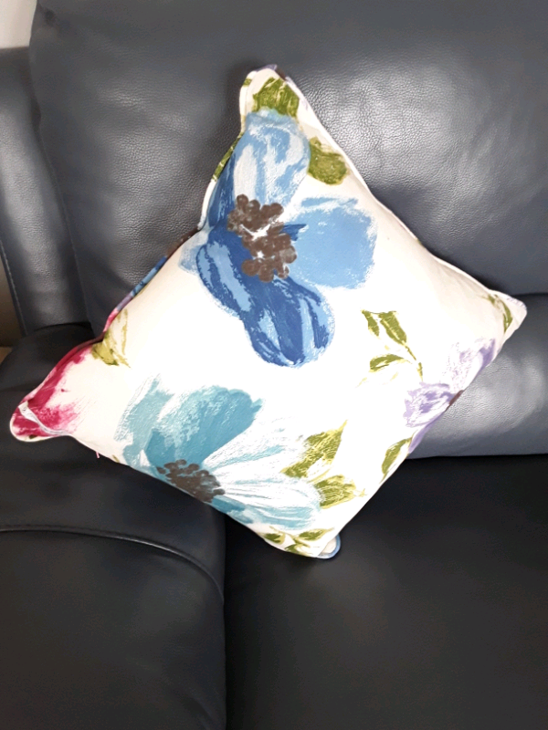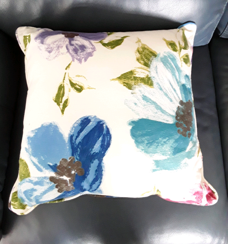 Exclusively by Elise........ 17 inch x 17 inch floral patterned cushion cover with inner. Floral colours are blue/purple/cerise with green foliage. See photos showing colour, style and sizing details of item.